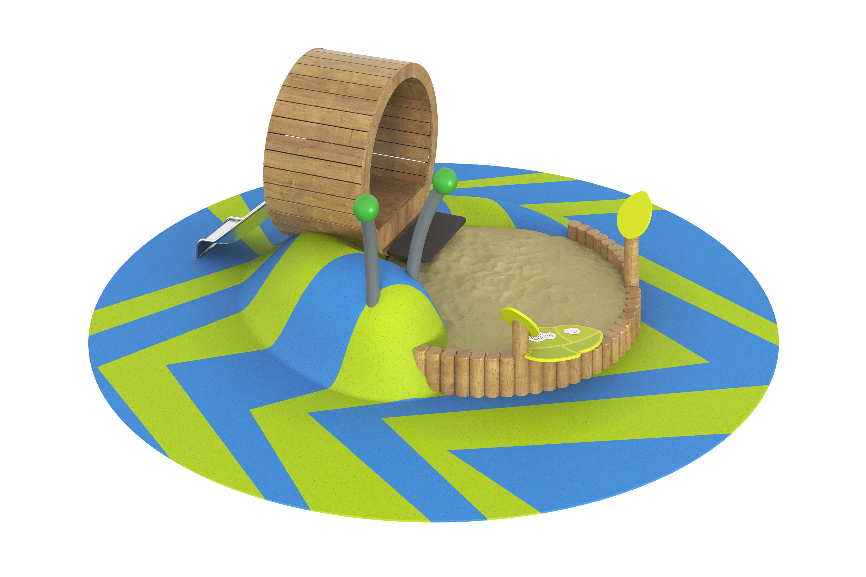 Основной элемент — горка, выполненная из нержавеющей стали, которая обеспечивает безопасность и долговечность. Дополнительные элементы, такие как лестницы и полы, созданы из влагостойкой фанеры с антискользящим покрытием, что делает их удобными для детей.