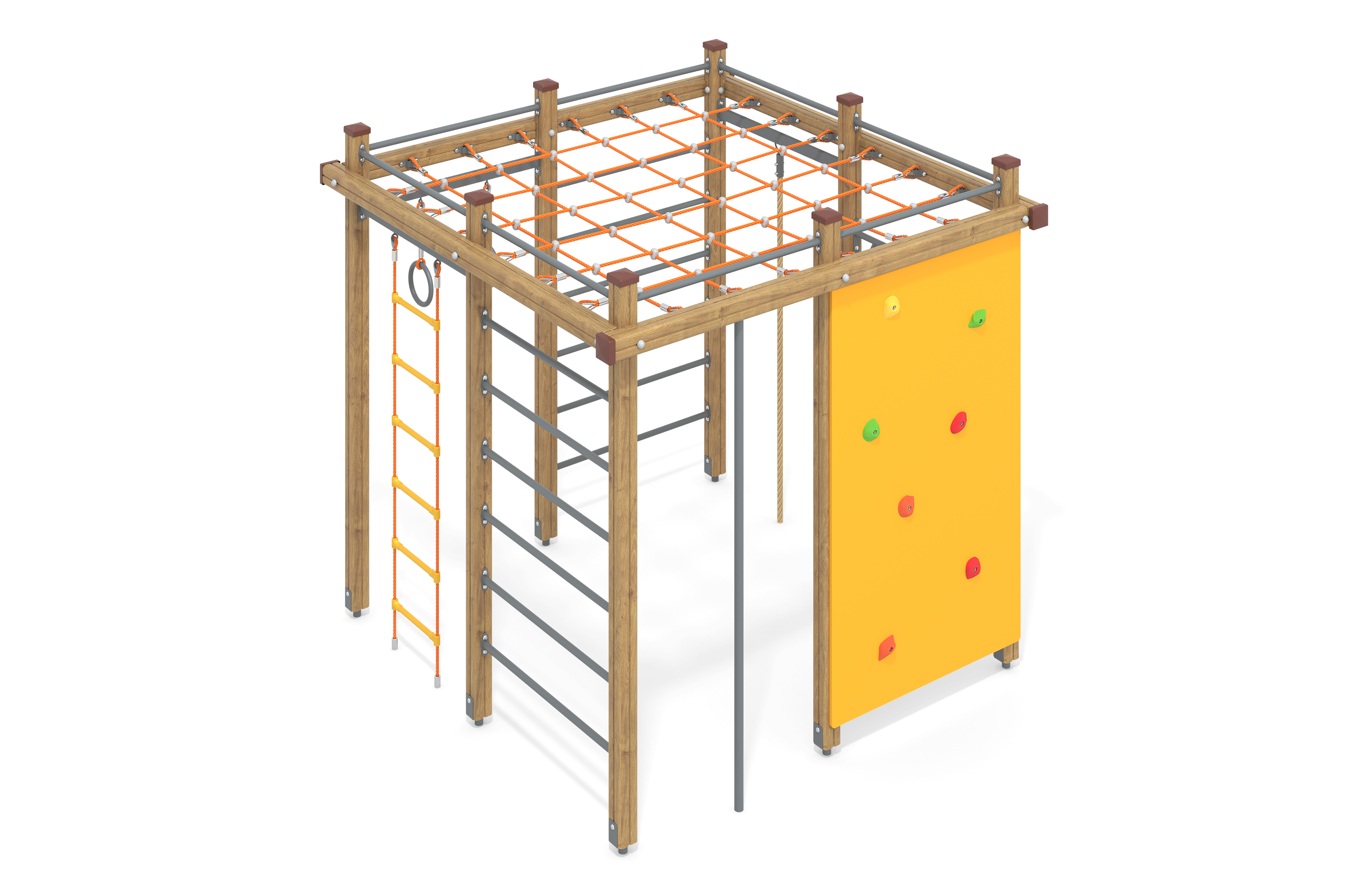 Сетка-паутина канатной части предлагает детям возможность для разнообразных игр и физической активности. Металлический опорный столб дает уверенность и стабильность, а его защитное покрытие защищает от воздействия внешней среды.