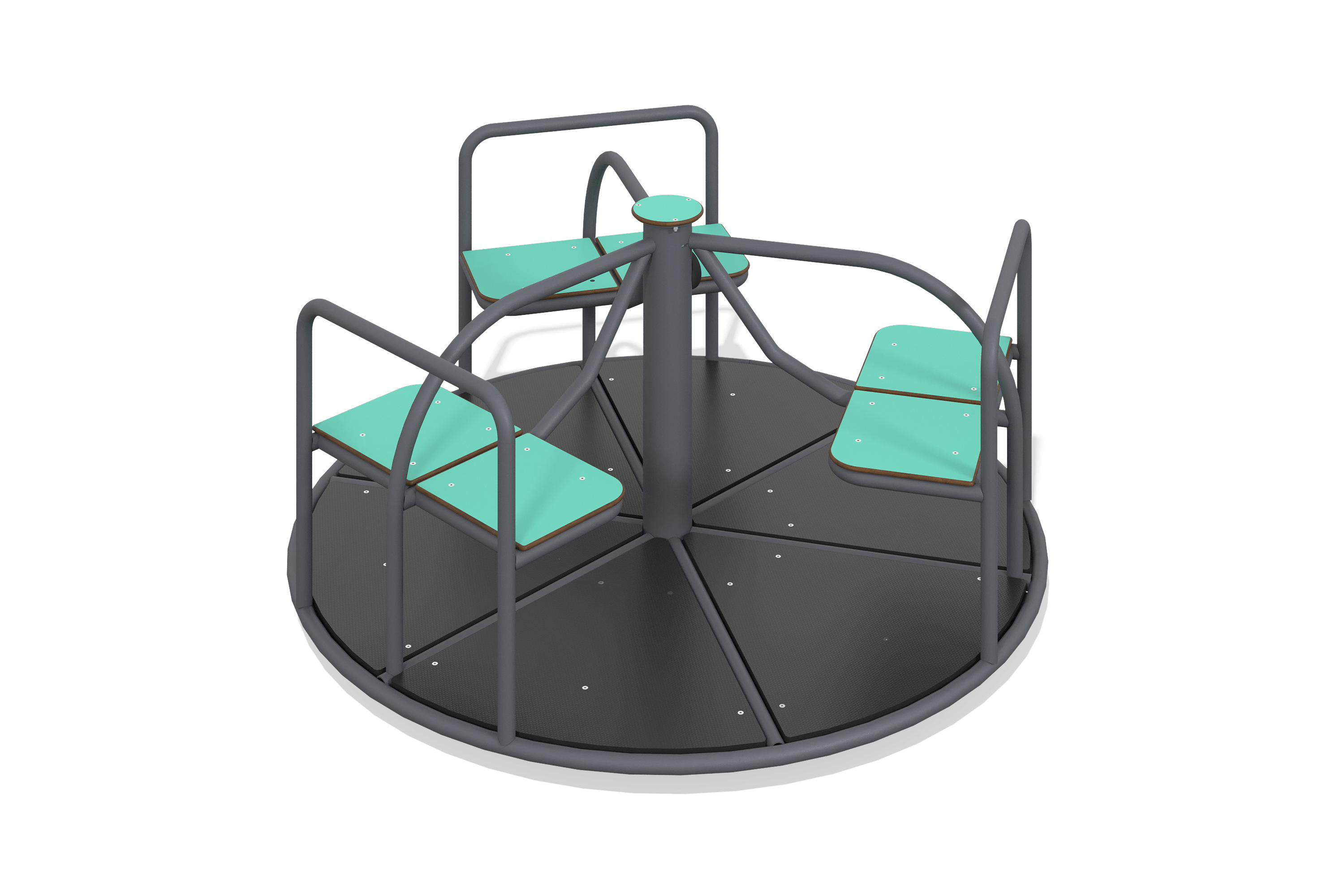 Сиденья удобно размещены на цельносварном каркасе, что гарантирует надежность и безопасность во время использования. Пол карусели оснащен антискользящим покрытием, что добавляет дополнительный уровень безопасности. Антиграффити покрытие на фанерных сиденьях облегчает уход за оборудованием. Все металлические детали защищены порошковой окраской, что гарантирует их долговечность. Карусель станет отличным дополнением к детской площадке или спортивной зоне, способствуя активным играм и физической активности.