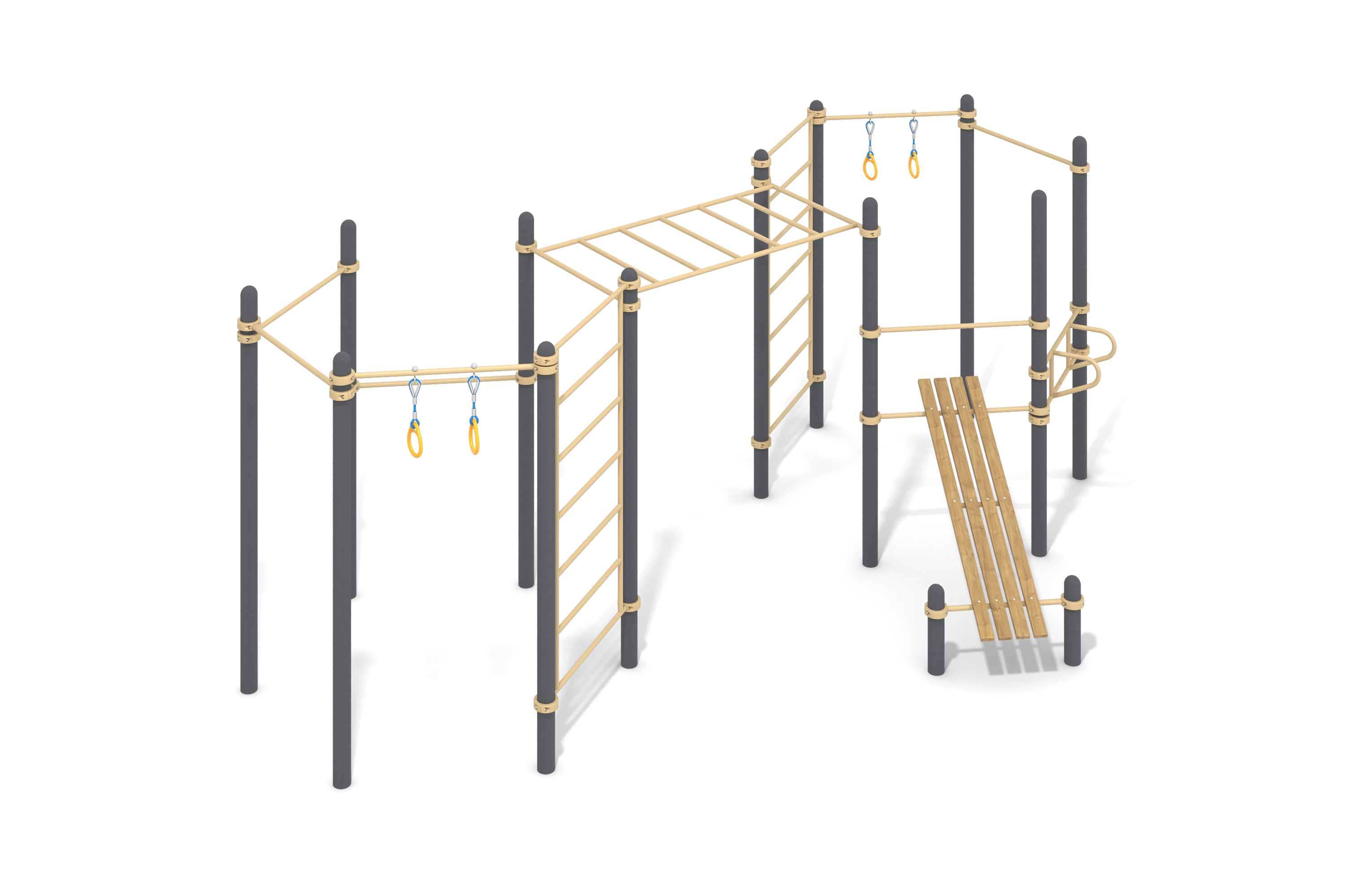 Ступени на переходе обеспечивают надежность благодаря антискользящему покрытию, а металлические перила добавляют уверенности во время игры. Модуль идеально подходит для детских площадок и развивающих центров, способствуя физической активности и социальной взаимодействия.
