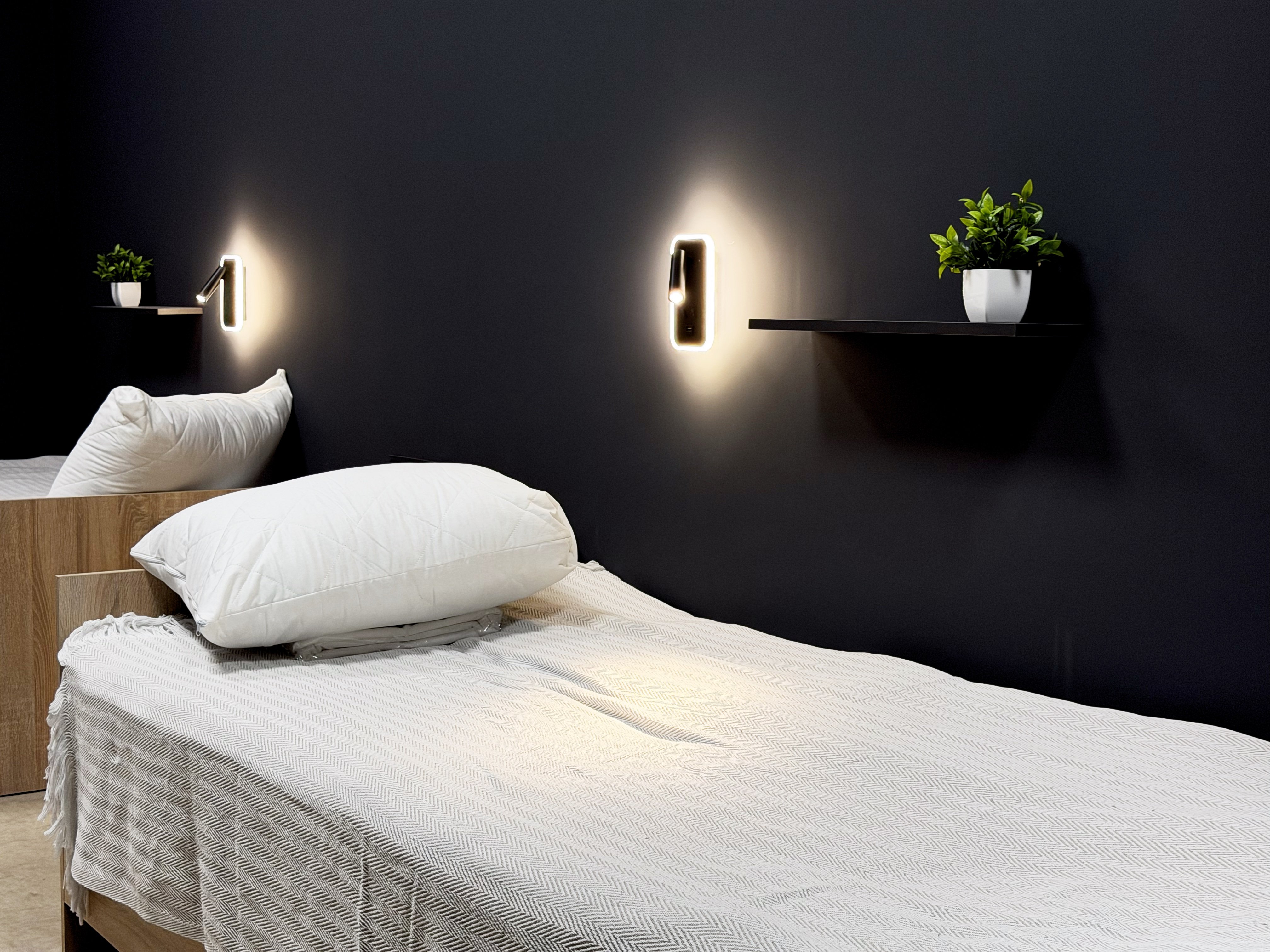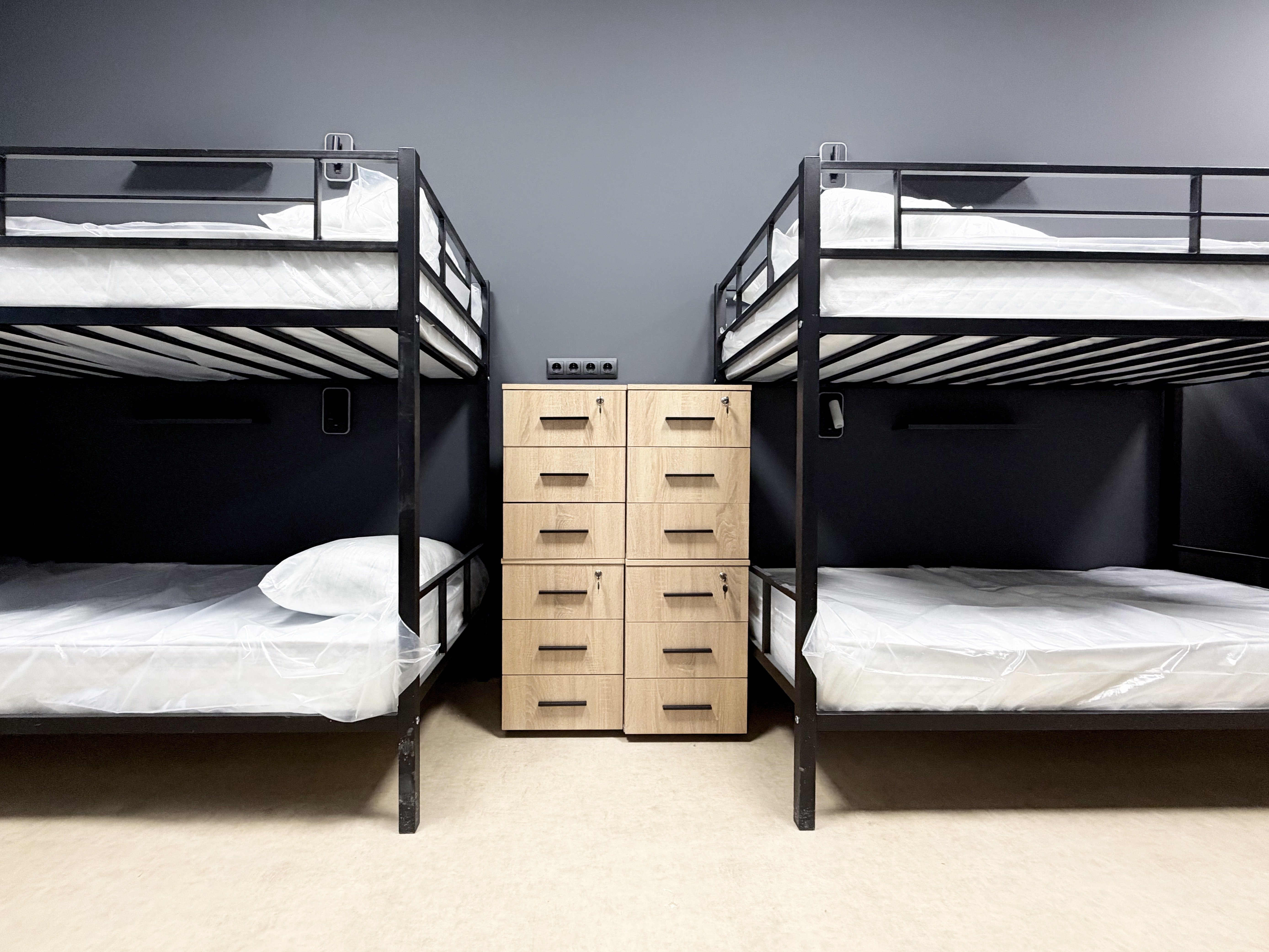 В апарт-отеле оборудованы современные спальни на 4 и 8 мест: удобные кровати, индивидуальные тумбы с замками, продуманная система хранения. Спокойная тёмная палитра интерьера и мягкое освещение помогают быстрее восстановить силы после смены, а индивидуальные бра создают личное пространство каждому.