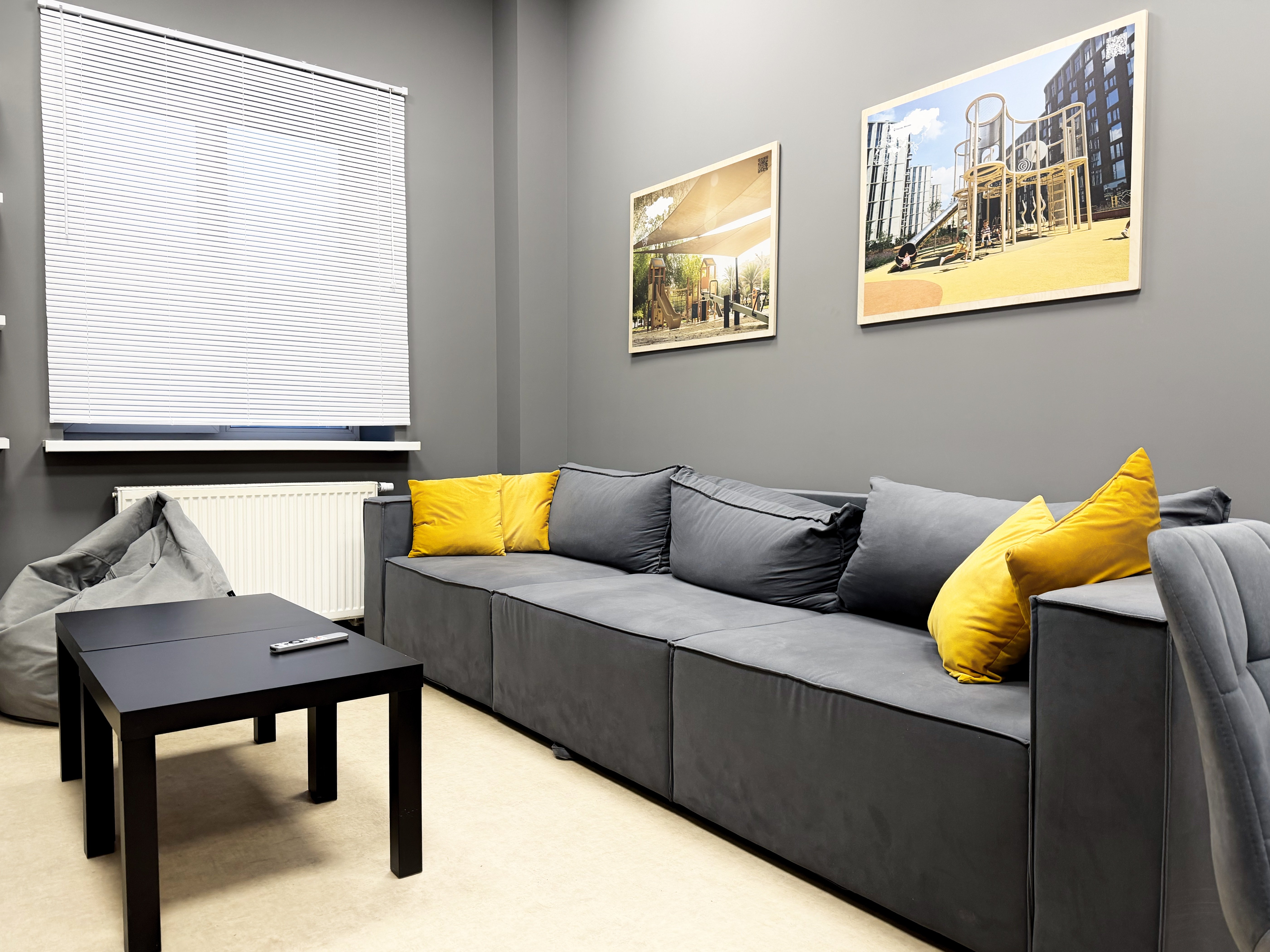 Общая гостиная оформлена как место для отдыха и общения: мягкая мебель, настольные игры, нейтральные оттенки и тёплый свет формируют домашнюю атмосферу. На кухне есть всё необходимое — плита, микроволновая печь, чайник, просторные рабочие поверхности и удобные сушилки для посуды.